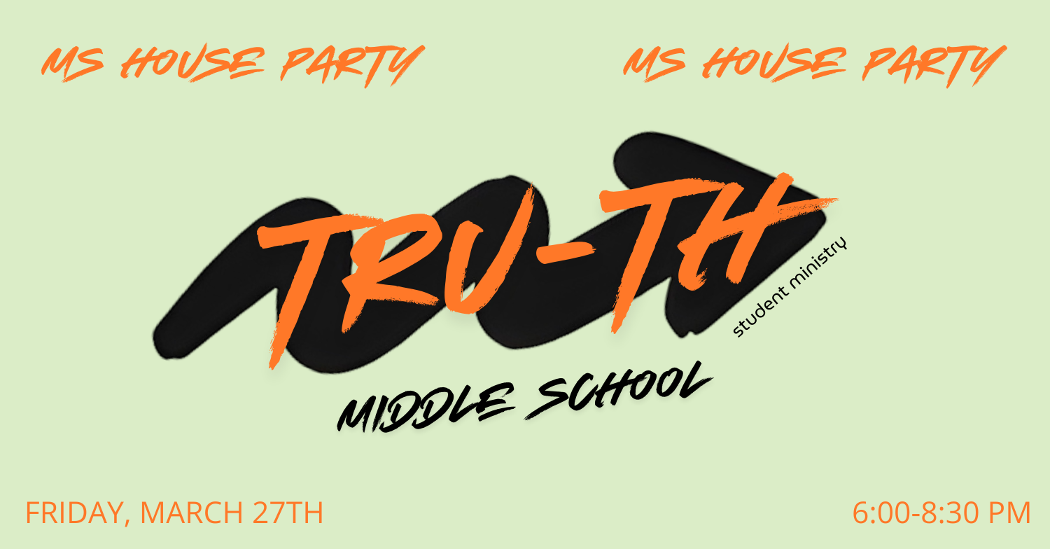 Middle School House Party! For students in 6th-8th grade. Friday, March 27th, 6:00-8:30 pm. Address: 2766 Michigan Avenue Road NE